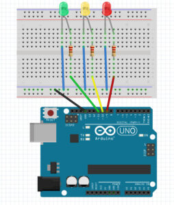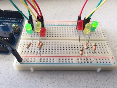 Naast het programmeren hebben we ook fysieke materialen en componenten gekregen, zoals LED-lampjes (voor rood, oranje en groen licht), weerstanden, breadboards en bedrading. Hiermee konden we een werkend prototype van de verkeerslichten opbouwen. Dit stelde ons in staat om onze code direct te testen op de hardware en te zien hoe de lichten daadwerkelijk reageerden op de ingevoerde instructies.